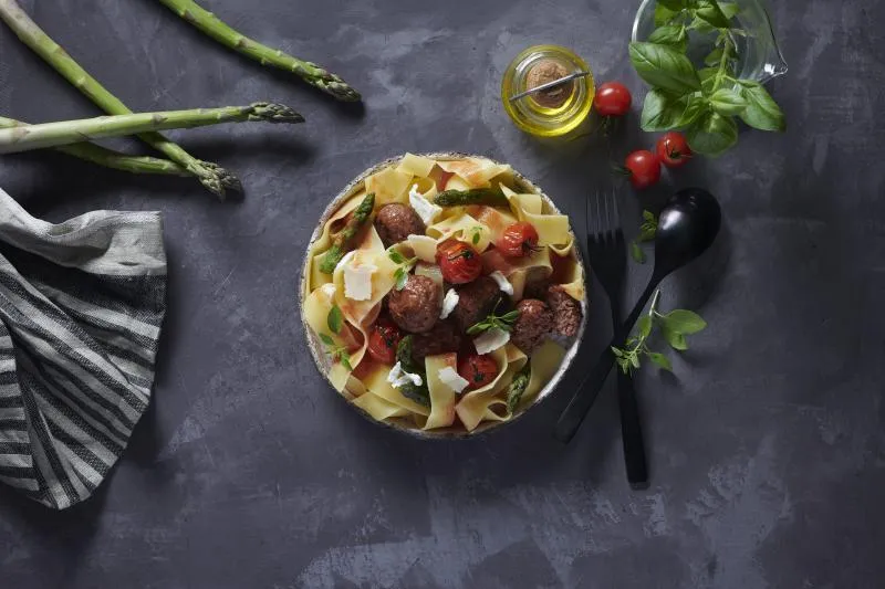 - Disposez les pâtes sur une assiette, ajoutez les pointes d'asperge et les boulettes. Agrémentez de copeaux de parmesan et de quelques feuilles de basilic. Servez !